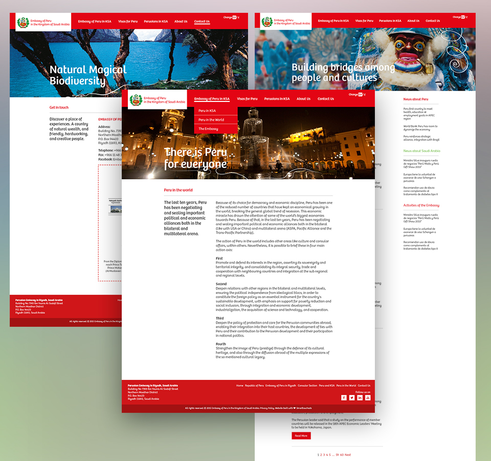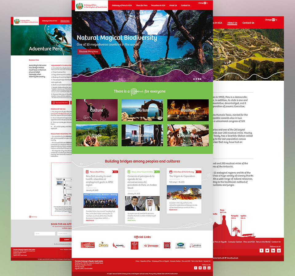 طلبت سفارة بيرو تصميم موقع إلكتروني جذاب وحيوي ليكون بمثابة تمثيل مثالي لها و لطبيعة البلاد الجميلة ويكون أيضاً ممثلاً لأعمالها التجارية الواعدة. وقد اختارت سفارة بيرو شركة سمارت تاتش للقيام بمهمة إنشاء الموقع الإلكتروني.